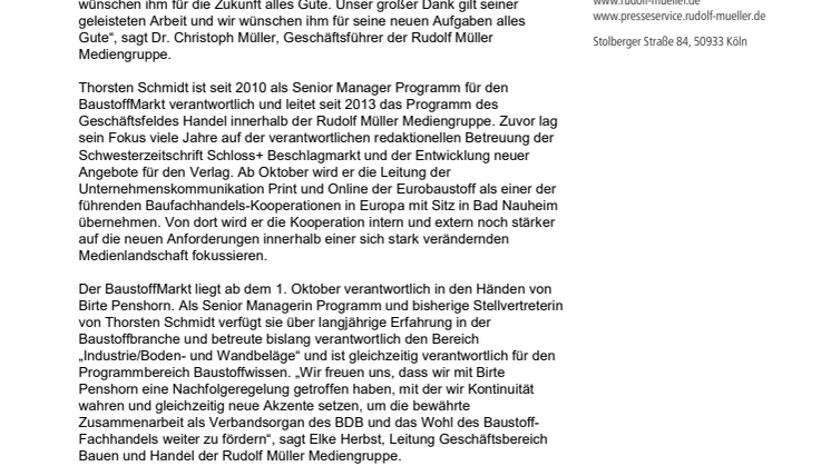 Köln, 3. September 2020 – Thorsten Schmidt, langjähriger Senior Manager des Wirtschaftsmagazins BaustoffMarkt, das zugleich Verbandsorgan des Deutschen Baustoff-Fachhandels (BDB) ist, wird die Rudolf Müller Mediengruppe zum 30. September 2020 verlassen und sich neuen Aufgaben widmen. „Wir bedauern das Ausscheiden von Thorsten Schmidt nach über 20 Jahren seiner Tätigkeit für die Branche und unser Haus sehr und wünschen ihm für die Zukunft alles Gute. Unser großer Dank gilt seiner geleisteten Arbeit und wir wünschen ihm für seine neuen Aufgaben alles Gute“, sagt Dr. Christoph Müller, Geschäftsführer der Rudolf Müller Mediengruppe.
